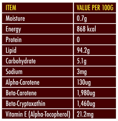 The table below summarizes the nutritional profile of Buah Merah (Red Fruit) oil extract conducted at Japanese Government authorized laboratories in Japan: